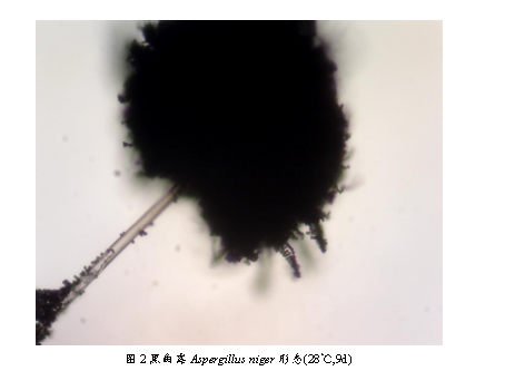 黑曲霉采用玻璃紙法在PDA培養基上接種,28℃培養。第2天即可看到黑曲霉產孢,但產孢較少,第3天可可明顯觀察到產孢量增多。黑曲霉菌絲有隔膜,為多細胞霉菌。菌絲體產生大量的分生孢子梗,分生孢子梗頂端膨大成為頂囊,一般呈球形。頂囊表面長滿一層或兩層輻射狀小梗(初生小梗與次生小梗)。最上層小梗瓶狀,頂端著生成串的球形分生孢子。孢子呈黑色。分生孢子梗生于足細胞上,并通過足細胞與營養菌絲相連。培養一周后,可看到明顯的孢子脫落。連續觀察2周,仍然可以觀察到黑曲霉的產孢結構,分生孢子易觀察。